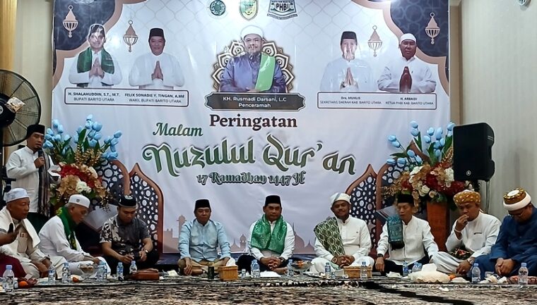 MUARA TEWEH, NK.com – Bupati Barito Utara H. Shalahuddin mengatakan, peringatan malam Nuzulul Quran ini merupakan momentum penting bagi umat Islam untuk semakin mendekatkan diri kepada Alquran serta menjadikannya sebagai pedoman dalam kehidupan sehari-hari.